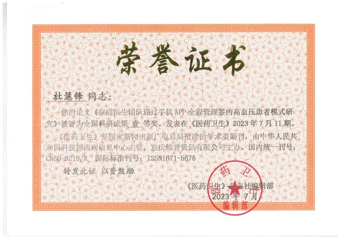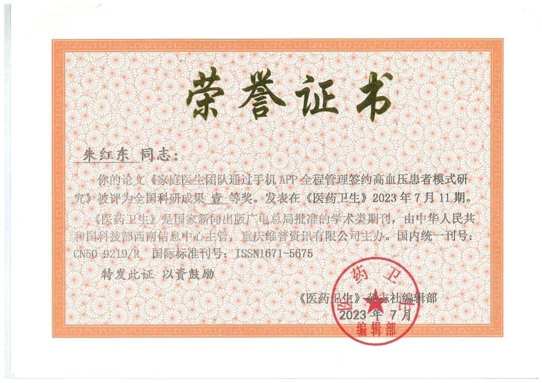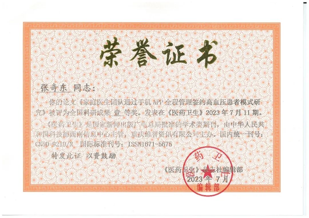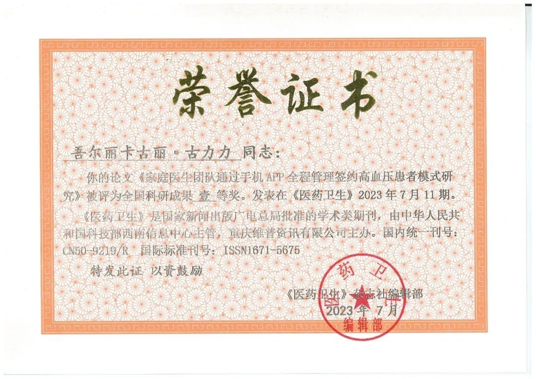 我院院长张奇东主任医师、内一病区、心血管内科主任杜慧锋副主任医师、药学部部长古丽药师、内二病区主任朱红冬联名撰写的论文《家庭医生团队通过手机APP全程管理签约高血压患者模式研究》被评为全国科研成果一等奖,发表在《医药卫生》2023年7月11期。